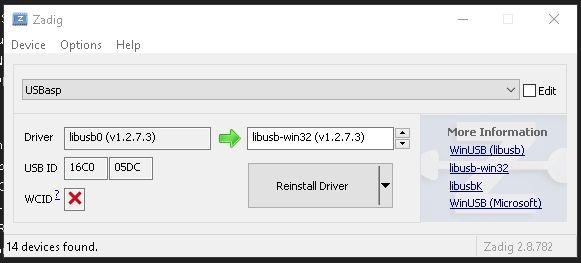 @ JIM - VID & PID match. @ matherp - I did follow the ZADIG program, and did select the win32 driver INITALLY, but when I rerun ZADIG, it says it is trying to use libusb0 driver, so I have selected libusb-win32, and will try again. This is how I am about to proceed: ![]() Wish me luck! EDIT: Nope. "Unable to detect MCU"..... However, NOW I am not getting the USBasb error line in AVRDUDE, and besides that I am also now getting a 2nd red blinking LED on the programmer module, when I try to do things, so I think AVRDUDE is happy enough that it can see the programmer now, so I will still take that as progress!!! Edited 2023-09-02 10:11 by Grogster Smoke makes things work. When the smoke gets out, it stops! |