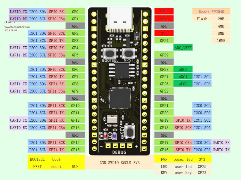 In the interest of showing another version I have been using the WeACT RP2040 which has most of the same features, 16MB Flash, USB-C but is not exactly pin-compatible with the genuine Pico. I have been using it at nominal speed but I have had it operate at 378MHz successfully as well. Since I am late to MMBasic I started with the PicoMite in its various forms. I used this particular version as a Pico replacement for Geoff's MicroMite LCD Backpack. I attach the pinout and I purchase this in Canada at the following https://universal-solder.ca/product/rp2040-pico-board-16mb-raspberry-pi/