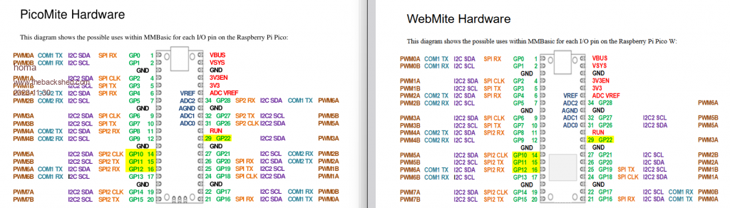 Are GP10, GP11, GP12 or GP22 used by anything special on the Pico W? I've never used one. Those pins are dedicated on that Waveshare board. Mick Zilog Inside! nascom.info for Nascom & Gemini Preliminary MMBasic docs & my PCB designs |