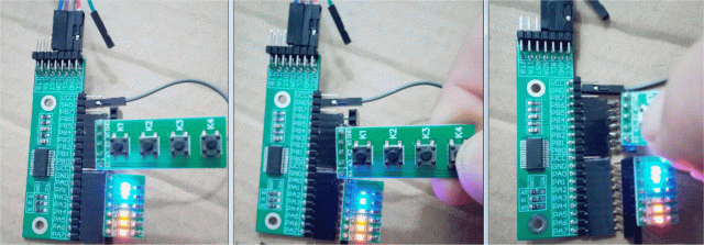 Here is working code, working hardware: ![]() ' MCP23017_IO.bas Const mcp23017 = &h20 ' A2, A1, A0, R/W all connected to 0V Const i2caddr=mcp23017 Const IODIRA = &h00 ' Port A IO Direction register DEFAULT = I/P Const IODIRB = &h01 ' Port B IO Direction register DEFAULT = I/P Const IOCON = &h0A ' IO Expander config register--address &h0B accesses same register Const GPIOA = &h12 ' Port A General purpose register Const GPIOB = &h13 ' Port B General Purpose register Const OLATA = &h14 ' Port A latch register Const OLATB = &h15 ' Port B latch register Const GPUPB = &h0D ' Port B pull-up register 'I2C2 open 100, 1000 I2C2 WRITE MCP23017,0,2,IODIRA,0 ' set direction to output I2C2 WRITE MCP23017,0,2,IODIRB,255 ' set direction to input I2C2 WRITE MCP23017,0,2,GPUPB,&hff ' set weak pullups on all bits mcp17 Pause 1000 Do mcp17in Loop Sub mcp17 Print "write to mcp23017" For i = 1 To 6 I2C2 Write MCP23017,0,2,OLATA,&b10101010 ' ' I2C2 Write MCP23017,0,2,OLATB,&b01010101 ' Pause 1000 I2C2 Write MCP23017,0,2,OLATA,&b01010101 ' ' I2C2 Write MCP23017,0,2,OLATB,&b10101010 ' Pause 1000 Next i I2C2 Write MCP23017,0,2,OLATA,0 ' turn all off 'I2C2 Write MCP23017,0,2,OLATB,0 ' turn all off Pause 1000 End Sub Sub mcp17in I2C2 write MCP23017,0,1,GPIOB I2C2 read MCP23017,0,1,portabits Text 0,20,Bin$(portabits,8) Print Bin$(portabits,8) I2C2 Write MCP23017,0,2,OLATA,portabits Pause 3000 End Sub Edited 2023-12-02 02:51 by lizby PicoMite, Armmite F4, SensorKits, MMBasic Hardware, Games, etc. on FOTS |