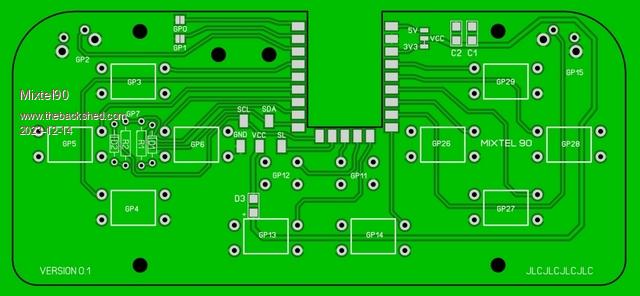 Single-sided PCB with up to 14 switches. The notch takes a RP2040-Zero surface mounted from the back. All this is currently in the design stage.