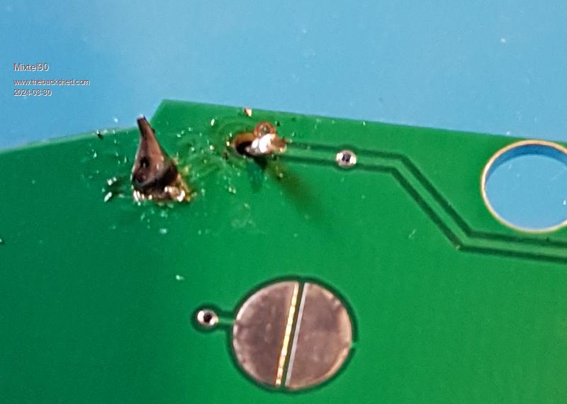 This is the other side of the board from the first pic. If you look back at that you'll see that the signal pad is isolated. It is actually on the switch side as you can see in this pic. You need to scratch the resist again, tin it, insert the switch and blob it from the track side as shown here.