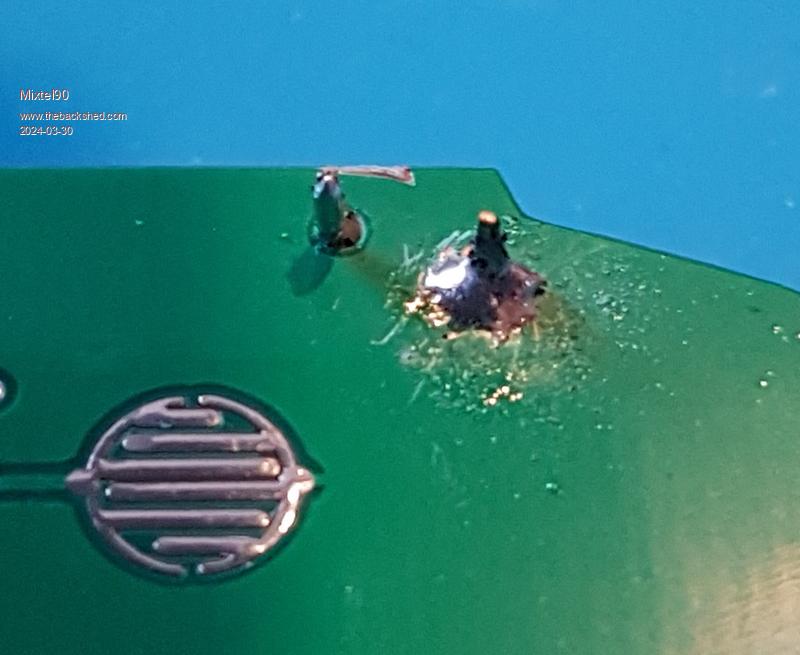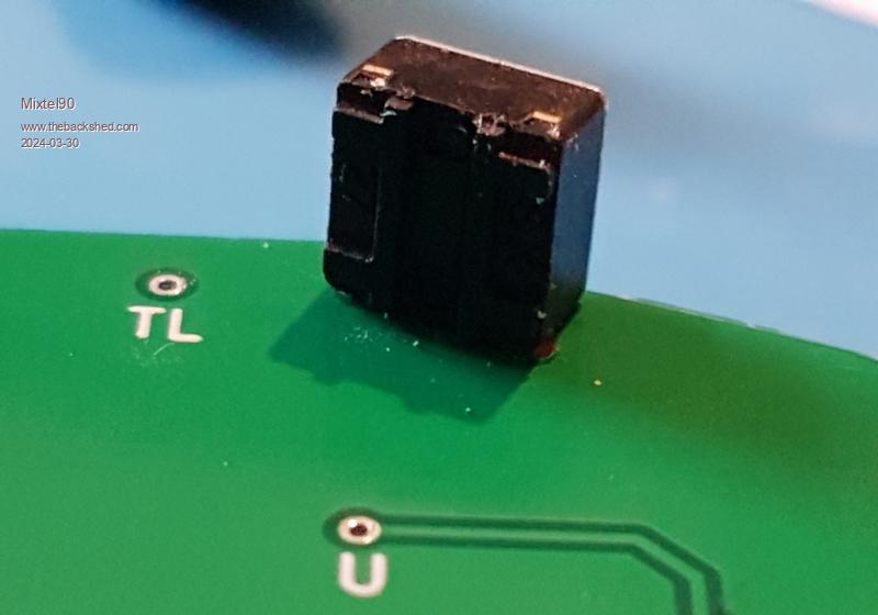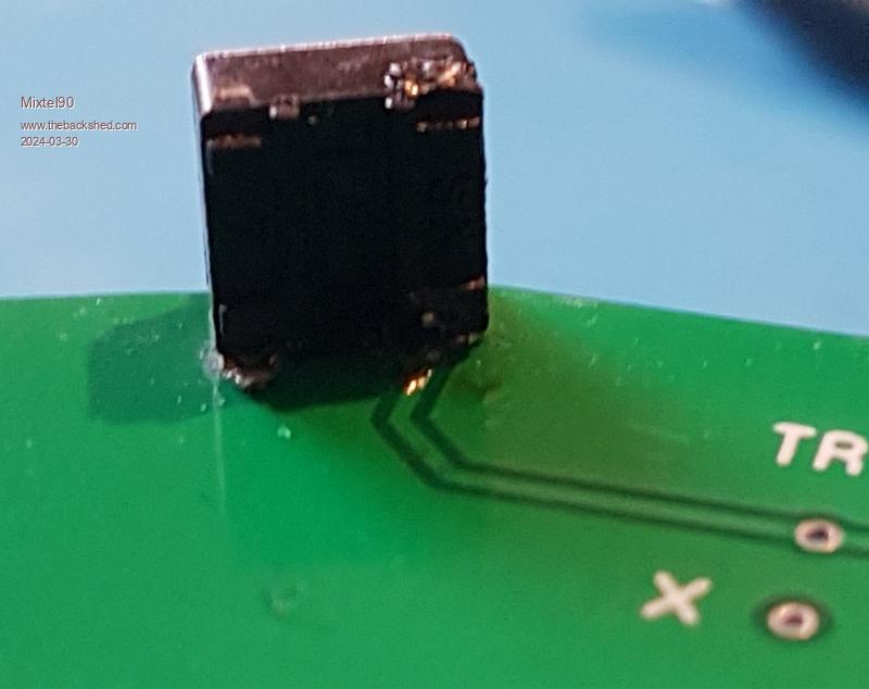 A bit more tricky. GND is on the left this time and that's a truly horrid joint. lol The signal line loses its pad so you have to scratch the solder resist again and blob the short switch pin onto it without it shorting to GND. The solder resist helps here if you avoid scratching it off the GND copper.