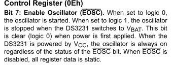 check the battery. I had an episode with some very poor coin cells (yellow ones about 1cm across and the voltage would drop to about 0.6V when on load (i.e. with the main power off), which is way below VBat (min 2.3V) required to keep things running without Vcc. In such cases, the internal oscilator will stop and the registers become static. Check Reg 0Fh bit 7... "A logic 1 in this bit indicates that the oscillator either is stopped or was stopped for some period and may be used to judge the validity of the timekeeping data. This bit is set to logic 1 any time that the oscillator stops. The following are examples of conditions that can cause the OSF bit to be set: 1) The first time power is applied. 2) The voltages present on both VCC and VBAT are insufficient to support oscillation. ..." case 2 was my problem - I think it might be yours too. p.s. you have to reset the flag, it won't clear by itself. google trnslation: Überprüfen Sie die Batterie. Ich hatte eine Episode mit einigen sehr schlechten Knopfzellen (gelbe mit einem Durchmesser von etwa 1 cm und die Spannung fiel unter Last (d. h. bei ausgeschaltetem Hauptstrom) auf etwa 0,6 V), was weit unter dem für die Aufrechterhaltung erforderlichen VBat (mindestens 2,3 V) liegt Dinge laufen ohne Vcc. In solchen Fällen stoppt der interne Oszillator und die Register werden statisch. Check Reg 0Fh Bit 7... „Eine logische 1 in diesem Bit zeigt an, dass der Oszillator entweder gestoppt ist oder für einen bestimmten Zeitraum gestoppt wurde und kann zur Beurteilung der Gültigkeit der Zeitnehmungsdaten verwendet werden. Dieses Bit wird jederzeit auf logisch 1 gesetzt dass der Oszillator stoppt. Im Folgenden finden Sie Beispiele für Bedingungen, die dazu führen können, dass das OSF-Bit gesetzt wird: 1) Beim ersten Einschalten der Stromversorgung. 2) Die an VCC und VBAT anliegenden Spannungen sind unzureichend ausreichend, um die Schwingung zu unterstützen. ...“ Fall 2 war mein Problem – ich denke, es könnte auch Ihres sein. p.s. Sie müssen das Flag zurücksetzen, es löscht sich nicht von selbst. Edited 2024-05-07 07:20 by CaptainBoing |