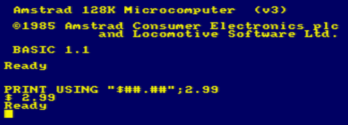 I just pulled up the TRS-80 Level II manual at: http://www.akhara.com/trs-80/docs/model1/Level%20II%20BASIC%20Reference%20Manual%20(1979)(Radio%20Shack)(pdf).zip On pages starting at 3-4 the 'Print Using' command is documented. I was surprised they didn't include left and right justification of the numbers. But other than that it did provide a lot of help getting things formatted properly. It would appear the author of the 'Print Using' envisioned it would be used heavily for printing checks. There is a lot of emphasis on printing the $ sign immediately in front of the number and filling unused space with * characters. |