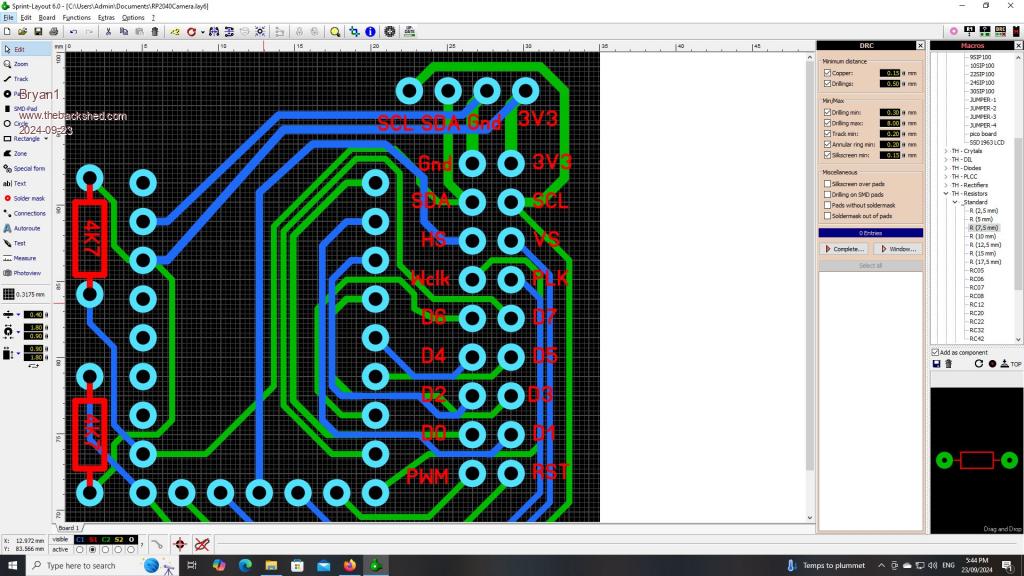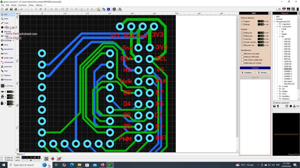 Ok just had to come down from the shed and get this PCB designed ![]() The board measures 35x34mm and all tracks fitted easily on both sides, now as I2C will be new to me do I have it right where the SDA and SCL lines from the camera module are tied to the zero and the output I2C pins ? On the zero D0-D7 are the bit lines, GP9 is XLKpin, GP10 is PLKpin, GP11 is HSpin, GP12 is VSpin and GP13 is the resetpin. Now as GP8 was free it was connected to the WCLK pin on the camera so the camera registers can be tweaked. RP2040Camera.zip Regards Bryan Edited 2024-09-23 16:06 by Bryan1 |