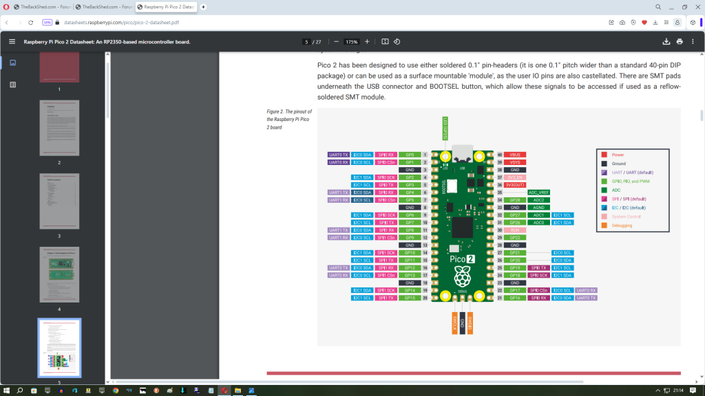 I realize the bit about schematics, the point is that there shouldn't be any need for the user of a board to need to use one. It's all very well saying that a pair of pins are allocated to SDA0 and SCL0 but those names are only valid for the language the board was designed for. Saying that they are GP0 and GP1 allows you to configure them in any language you like as those names relate to the processor, not the language. This is very important on the RP2350 as, across 48 IO pins, you have 12 pins that can be SDA0 and twelve that can be SCL0 - and you don't have to use adjacent pairs. :) PicoGAME SPGA would be an interesting config string when you get to the joystick/controller/I2C/COM port that can use any combination of GP0,GP1,GP2,GP3,GP45 and GP46. The latter two are also COM1 for the ESP8266 and ADC pins on the back and alternatives for pins 5 and 9 on the controller port, which are usually GP4 and GP5. Or something like that. :) It might do SPI too, but I haven't checked that. :) And that's without hacking the board. You see why documentation is important? (Even I'm confused. Goes off for a coffee and a couple of dried frog pills.) The thing is, the Pico is designed to be an embedded controller. As such it's IO never changes once it's installed. It's us that are "using it wrong". The same goes for the Arduino and microcontrollers in general. SBCs like the Pi are far less dependent on their GPIO for interaction with the user and are far less configurable in that respect. Mick Zilog Inside! nascom.info for Nascom & Gemini Preliminary MMBasic docs & my PCB designs |