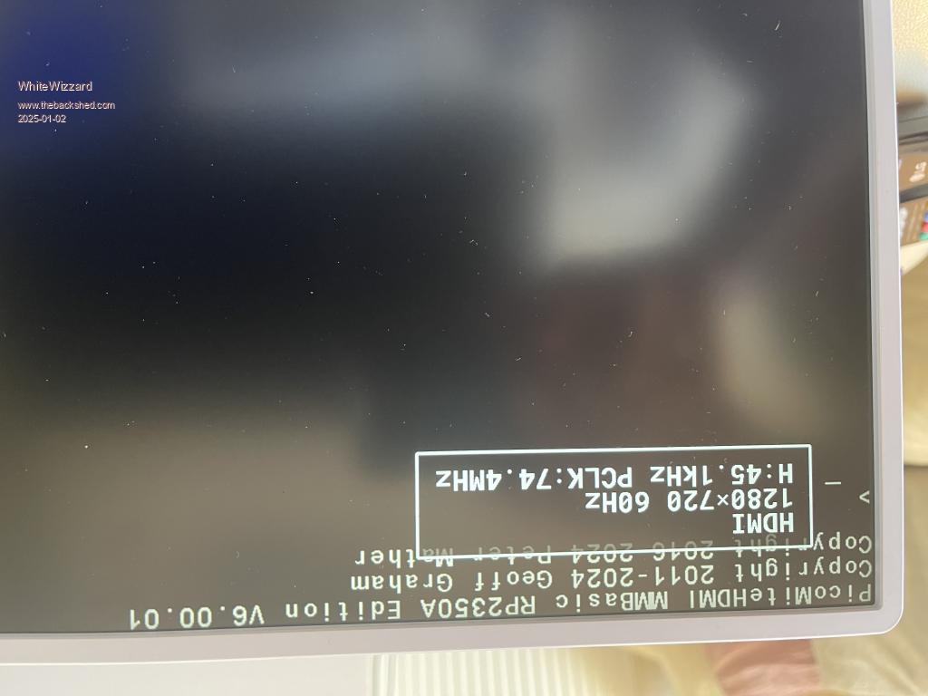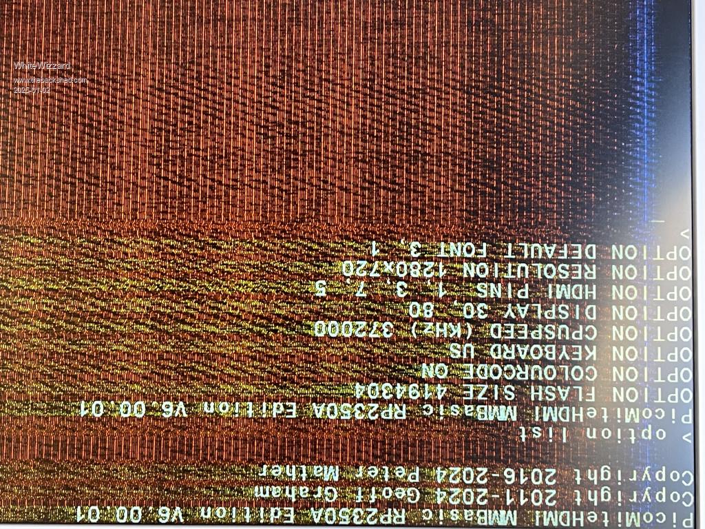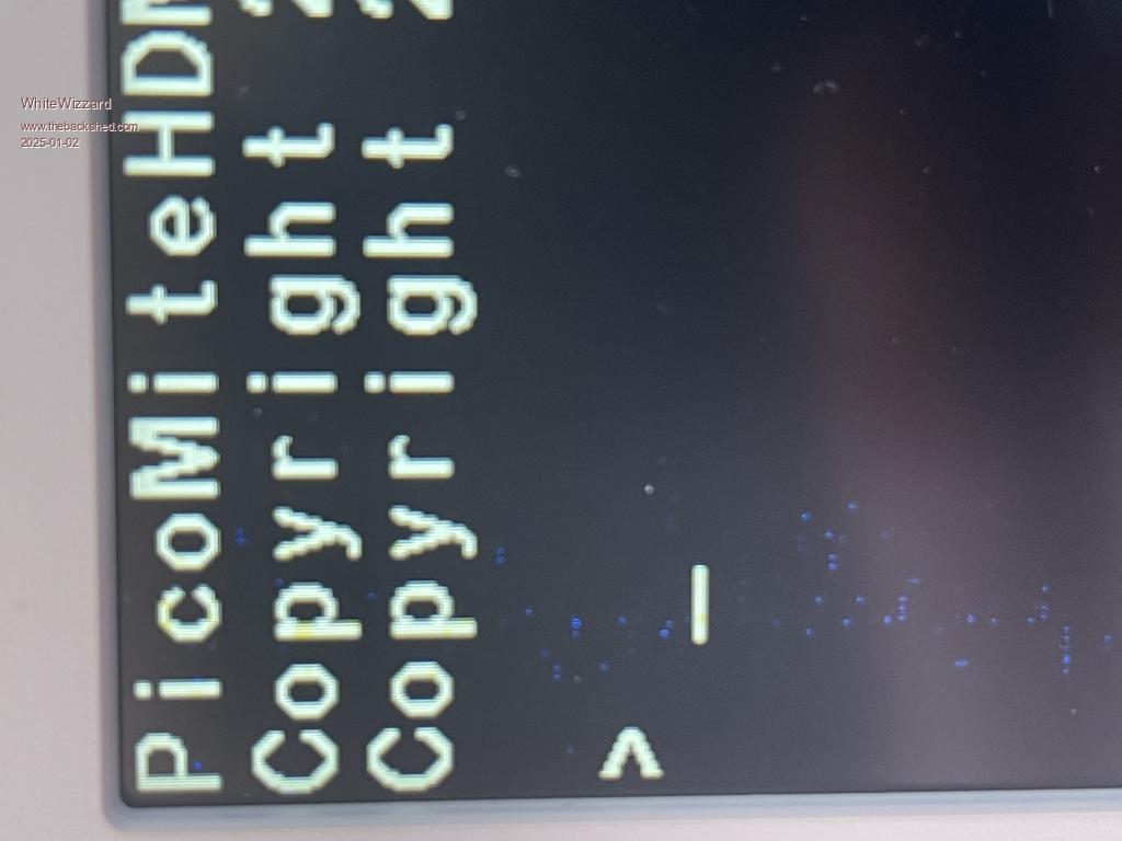 Hi Peter, Using a genuine RPi Pico 2 on an Olimex carrier (for HDMI output - and for SD card when ready to configure). I am seeing ‘noise’ on the screen and am wondering if it has anything to do with potential track length differences for the video signal-lines - your thoughts suggestions welcome….. Screenshot shows version number and OPTION settings (not sure why it is upside down!) Note that placing my finger near/on the pins will affect the amount of noise displayed - this is the extreme shown immediately below. ![]() Here is the best I can get (but still shows a column of noise). ![]() Tried various leads, good power sources for monitor and laptop - Pico/Olimes powered via USB from laptop for monitoring via TeraTerm. ![]() Edited 2025-01-03 06:56 by WhiteWizzard |