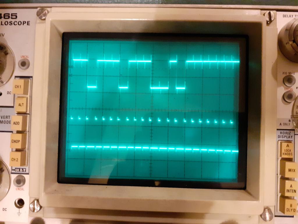 A quick update. I built the protoboard USB rig tonight to have a look at the signal flow between the DRO and LCD Display. A combination of noise and my lack of skill (I seem to have forgotten everything I once knew about using a scope) slowed progress quite considerably. I eventually re-rigged things and the noise improved but synching was still a problem. It finally dawned on me to dig out a second scope probe and use the clock line to synch on the signal line. ![]() So, there it is, a 21 Bit clock signal that runs for 2ms, followed by a 4ms gap. The data signal occurs during the clock period. So I now have something to work with on the software side. The iGaging 21Bit Arduino code should therefor be a good starting point but I'm sorry to report that (as you both expected I think) the CoPilot MMB translation isn't going to to work out the box, although there is probably still a helpful framework there for me to work on. That's for another night now though. Regards, IanT |