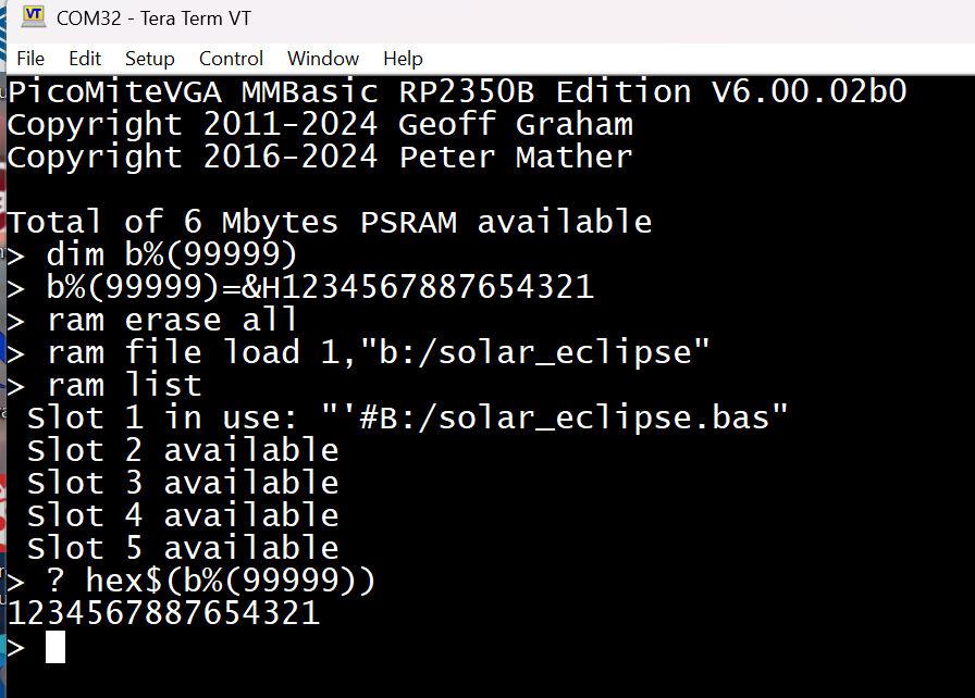 Hello Peter, after the joke "Fun with Romans" now for something sensible: When I saw this thread, something spontaneously occurred to me: I have a Pimoroni Pico Plus 2 and have the PSRAM enabled (with OPTION ..). Then you have an incredible amount of free memory, but which BASIC program needs 8MB? So I thought it would be great to have a RAM disk on the PICOMITE! So - how about: OPTION RAMDISK PSRAM 2048 'kBytes or if there is no PSRAM but for example an RP2350 with 520kB internal RAM: OPTION RAMDISK RAM 128 'kBytes The RAM disk should then be given the drive letter C: and should be operated with FAT. The FAT file system is in the code for SD cards anyway. LittleFs would be too inefficient for that. It is only good for flash and has poor write performance and files can grow up to twice their required space when rewritten unless committed (by flush() or close()). Thank you for your work and continued work! bfwolf |