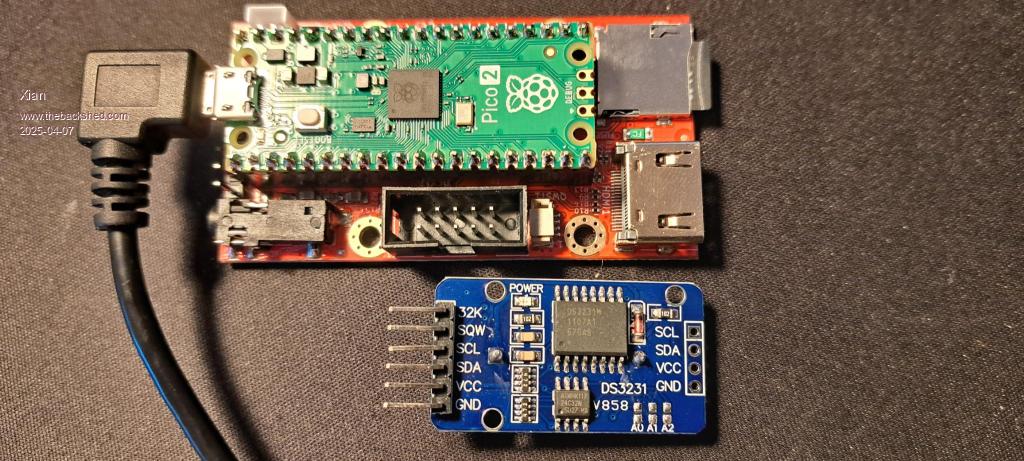Christian, Print mounted at the bottom with M2 nylon bushings with 2 holes and spacers between Olimex DS3231 and third hole for support. The two holes on Olimex print on the side without connector correspond approximately to DS3231 hence M2 bushings. Make sure that button cell at the bottom is accessible for replacement. The 4 wires directly soldered to the bottom Olimex 10-pin print connector pin 1,2,5,6. 1=3V3, 2=GND, 5=SCL=GP9, 6=SDA=GP8. The other 2 spacers next to the 10-pin Olimex connector are 18.7 mm (8+10mm) for me. Can be M2 or M3 bushings. The top 10-pin flat cable connector is therefore still usable and not affected by the DS3231 module. The 3 pins GP0 and GP1 and GND above next to USB can be used for an external UART COM1 with HDMI firmware. Now a template for the pin numbers and have used for Pico print pins with long pins and print connector sockets with long pins which work well. Greetings, Jan. |