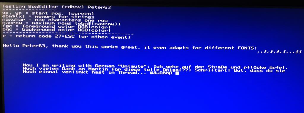 I've tested your boxEditor with German "Umlaute" (ÄöÜüß...) and Martins converted Font and the workaround for detecting the correct german keys (ÄäÖöÜüß) on the keyboard. I don't know if this also works for USB, for now it is only for a PS/2 keyboard.