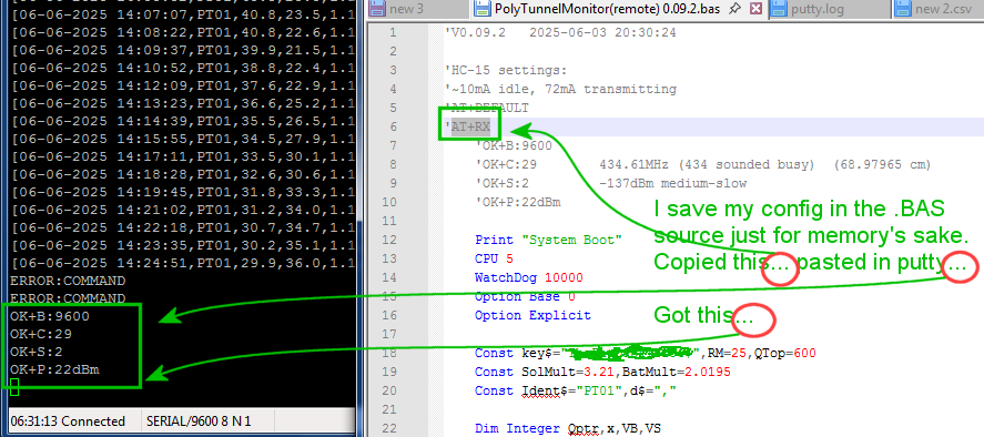 The HC-12 was my go-to for a short UHF link (and probably will be for an easy hit) and I did consider them for this project but I was scared off by the brickwork in the way over the route. It was a leap of faith (and hope of a simple "cure") in what others were claiming for LoRa that made me go for the HC-15 (UART was a big winner - a lot of LoRa modules seem to use SPI which was a deal breaker on this project)... you have to be more aware of how the radio works - they aren't the simple "stream of bits" you get with HC-12s and you are wise to use the STAT pin to make sure you don't over-run the buffer. By this I mean, with the HC-12, the "away" speed is the same as your interface speed. With LoRa (and more specifically, these HC-15s), things are assembled into packets and the away speed is likely much slower than the interface speed. Without taking note of STAT you could easily just send tons of data and there'll be losses because the hardware cant keep up. That said, there is a 1K buffer on the interface. In my code, I have a WaitSTAT sub which I call before I send and again just before the warm-down period before I switch the power off - I appreciate mine is an "edge case". At the Rx end, you have to be aware that a "line of text" may not arrive as a line, but broken into a number of packets... if your line length exceeds the packet length you might need to have some of your own encapsulation to tell when you can process the line - but LINE INPUT# should work fine. Once you take these changes in approach in hand and write thoughtful/accomodating software, they seem to provide and almost bomb-proof UHF link in demanding conditions. I love 'em and I think they are my new go-to because I don't seem to have to worry about walls and stuff.