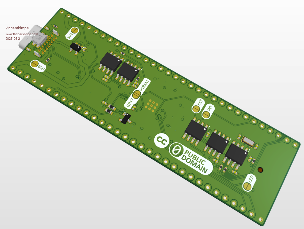 GIThub Link An RP2350 Packaged as a 64 pin DIP package. This can run MMBasic or CircuitPython or anything you want. The intended use is as a MICROCONTROLLER in an EMBEDDED application, not as a computer. Think STM32, PIC32 kind of application. Using a standard DIP64 allows simple thru-hole construction , breadboarding etc. it fits a standard 64 pin socket. No need for castellation or weird pin spacings - USB Type-C connector. Right angle , thru hole for mechanical stability. Long overhang so you can have this go through an enclosure wall. - USB powered or self powered. Self powered up to 12 volt. - Ideal diode / or-ing / e-fuse circuit (optional) to prevent backfeeding usb. - Current limit on the ideal diode. The circuit can be used as a power or-ing to provide backup power from a Li-Ion cell and charger - ESD protection on the USB port using TVS diodes - 3v3 DC/Dc regulator can deliver up to 1A of load current. In this case you need to provide 5v as USB cannot provide source current. - RP2350B in 80 pin QFN with all 48 GPIO brought out. - Flash 128Mbit - optional PSRAM on GPIO47 - optional 3v reference for analog circuitry LM4040-3 - Heartbeat led on gp25 with solder bridge. Can be removed from circuit. - Using Abracon XTAL and polarized inductor for 1v1 regulator - Boot and Reset button. Secondary boot button under usb so you can use a paperclip through the enclosure to force boot. - on board, optional i2c bus : I2C EEPROM or FRAM I2C RTC with battery backup 1220 cell. - cheap version using an M41t11 - precision using a MEMS DS3231. Option to use brown-out detection to hold cpu in reset till power stabilizes. Optional interrupt on GPIO21. User needs to wire the i2c bus to desired io port. - 4 layer board with controlled impedance and power planes. Board designed so it can be made at OshPark, JLCPCB or PCBway - CAD source available under Creative Commons ZERO . Public Domain License. Altium Format. - Production pack (gerber/drill/bom available. - BOM is procurable from Digikey/Mouser as well as LCSC (Asia) with direct LCSC order codes if you want this to be partially assembled by JLCPCB. - Pinheaders to be used are the turned pin type. Not the square Dupont style that destroys breadboards and ic sockets. Preci-Dip or equivalent. Comments welcome |