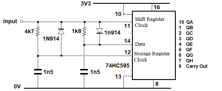 The fixed width font of a code box untangles the mess. That looks interesting so will have a go at reading it with MMBasic. It looks like you set the pin as an output to charge the capacitor then switch the pin to input and measure how long it takes to discharge. ┌────────────┐ The keypad that I tested with has an 8-pin header: │ 1 2 3 A │─┳──────┐ 1 - row 2 (4,5,6,B) │ │ 30K │ 2 - row 3 (7,8,9,C) │ 4 5 6 B │─┫ ⏚ 3 - column 1 (1,4,7,*) │ │ 30K 4 - row 4 (*,0,#,D) │ 7 8 9 C │─┫ 5 - column 2 (2,5,8,0) │ │ 30K 6 - column 3 (3,6,9,#) │ * 0 # D │─┫ 7 - column 4 (A,B,C,D) └────────────┘ 30K 8 - row 1 (1,2,3,A) │ ┣┻┻┻────┘ 7.5K ┣─────────────────── I/O pin 1000pF As I mentioned to Mick I have a heap of 74HC595s left over from a project years ago so they are effectively free. They must be good for something! :) Edited 2026-02-19 07:05 by phil99 |