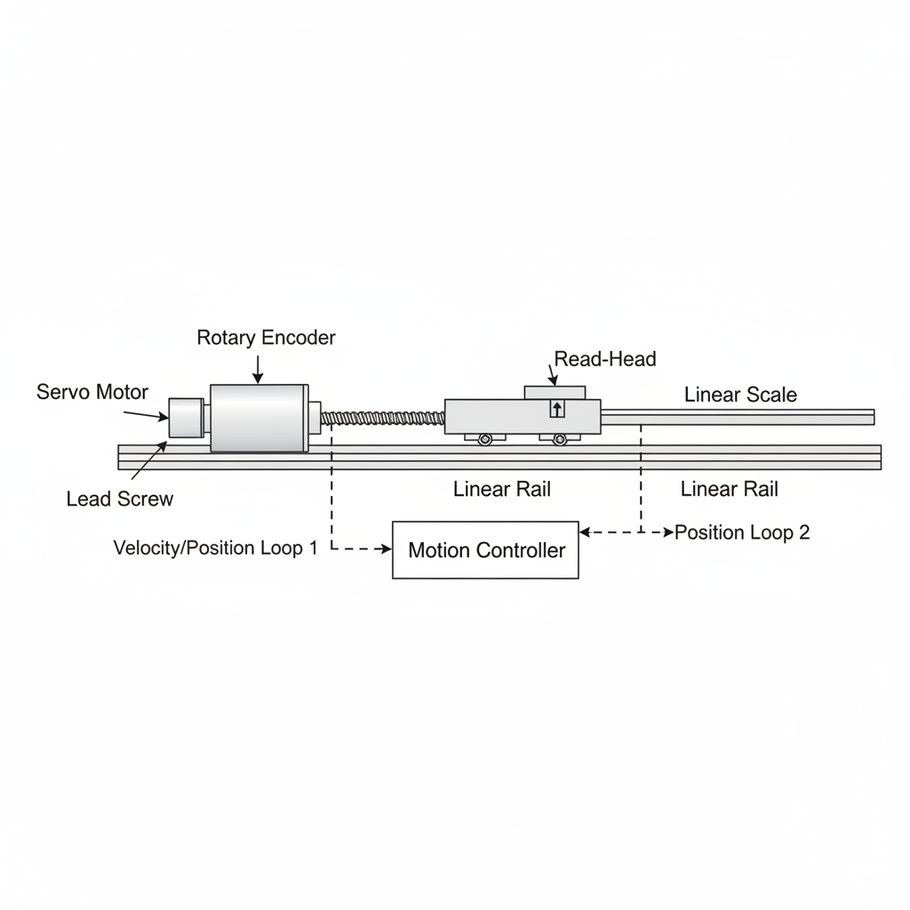Quote  A linear rail with a carriage, powered by a servo-motor but with "dual-loop" feedback (rotary encoder for the motor and linear scale for the carriage)