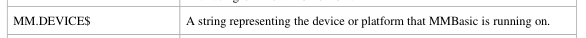 With so many variations of MMBasic it became more and more impractical to list the various values of MM.DEVICE$ and keep the list accurate and complete. That is why the listing disappeared from the manual. MM.DEVICE$ is quite handy if you want to check that the program is running on the platform that you wrote it for. In that case you can print its value on the console, then embed the response in the program. But, I agree, it is not that easy if you want to check if your program is running on a platform that you do not have access to. Geoff Geoff Graham - http://geoffg.net |