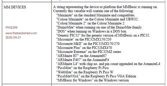 Forum Index : Microcontroller and PC projects : MM.DEVICE$. For Picomite?
