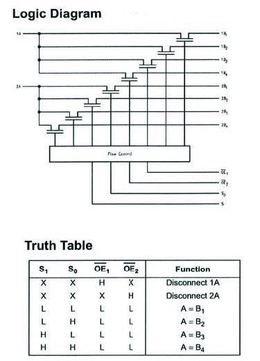 Had a look at that FST3253 Dual 4:1 Multiplexor/Demultiplexor Bus Switch but unfortunately (if I've understood the datasheet correctly) it won't do the job. Here is the Logic Diagram and Truth Table from the datasheet...