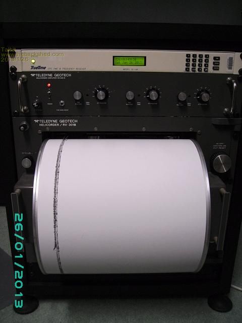 Here's a happy snap of the two boards. I have done a complete run of the data I have. It looks okay but I'll re-do it with a larger gap between the traces on the drum recorder. This shoul allow me to up the size of the trace on the seismogram without it looking too messy. It runs for about 14 hours as previously calculated. Trevor Talbit |