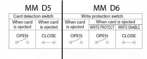 Sorry David, Yes that is a very bad example, I apologise, I saw it in amongst the many data snippets I have from when I designed the UBW32-MCC PCB and didnt read it properly. Basically the D5 and D6 pins have internal pullups and the D5 is LOW when card is INSERTED and HIGH when EJECTED. D6 is LOW when Write ENABLE and HIGH when Write Protected. The uSD socket I selected for the UBW32-MCC only had one switch for card present so I linked both D5 and D6 together as uSD cards dont have a WP switch. You can safely just short D5 and D6 to GND but I dont know what the MM would do if there is no card inserted. Regards, Mick Mick's uMite Stuff can be found >>> HERE (Kindly hosted by Dontronics) <<< |
