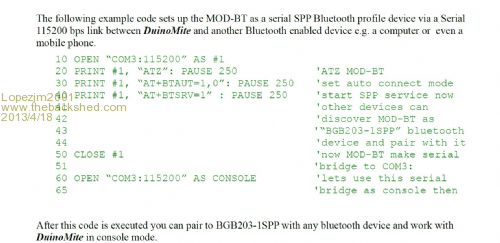 I have ordered and received a MOD-BT (Uext bluetooth device) to use with my Duinomite Mega from Dontronics. I run the following basic program below and it seems to work but my MOD-BT is not being discovered. I only see the LED on for a second when I plug in me MOD-BT but at no other time does the LED light up. Does the LED of the MOD-BT suppose to light up at any other time other than when being powered up? When I run it the MOD-BT cannot be discovered by either my computer or Ipad1 which have discovered each other but not my MOD-BT. I did a google search and I found this https://www.olimex.com/Products/Duino/Duinomite/DUINOMITE-eM EGA/resources/MOD-BT_DUINOMITE_connection_fix.pdf The MOD_BT PCB is dated 2009 which is three years before the connection fix was discovered on september 2012 which means I need to do the connection fix. Anyhow I have followed the connection fix several times by shorting out pin 2 and 7 on the Uext, reconfigure MOD-BT and flash the change to the MOD-BT etc. But still the MOD-BT cannot be discovered. Anyhow I was hoping that maybe someone on this forum has some experience using a MOD-BT with a Duinomite Mega and have some tips for me. I am thinking that maybe I received a dud MOD-BT. Thanks in advance, John Lopez Lopez |