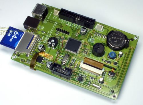 bovist said  I ommitted the Arduino connector since 4 analog inputs plus one digital output are to be used for the touchscreen interface and the buzzer. Also, my new small PCB (only slightly larger than the display itself) simply has no space left...