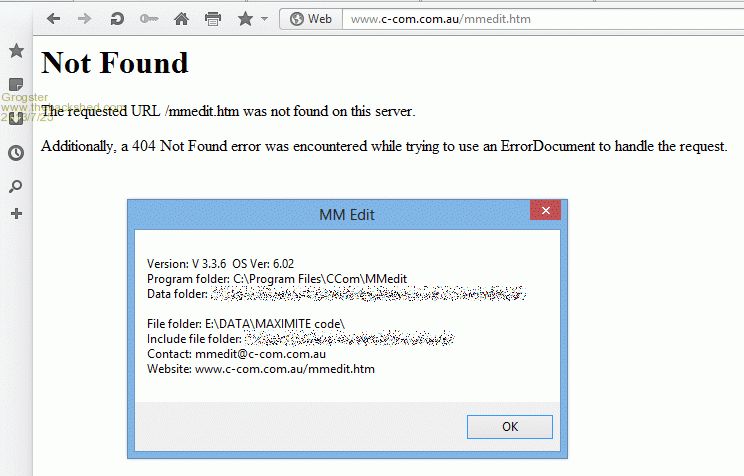 The link in MMEdit's ABOUT window does not work. I tried www.c-com.com.au/mmedit.htm as in the window, but it is 404 not found. 404 also for www.c-com.au/mmedit.htm