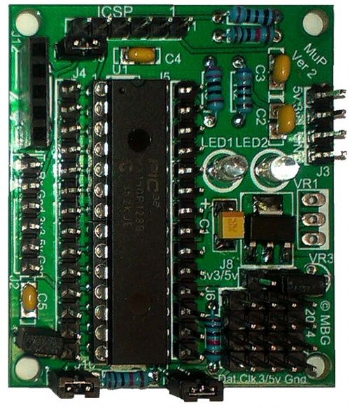 Mick, What would be the correct way to program and power the Mup from a PicKit3 when VR3 is mounted? If i connect the PicKit3 then both led's are on indicating that current is flowing from the 5v line through the red led. That means there is a current going through the Voltage regulator. I measured 3.2v on both 3.3v and 5v nets. The 5v net gets enough current for at least the led. I don't see another way to solve that then adding a jumper between the Voltage regulators Vout and the Vcc net. In the block diagram of the MCP1702 there is a diode allowing current going from Vout to Vin. I did not measure a voltage drop. If nothing else is connected to the Mup, i think it would not be a problem at all. I programmed the chip without any problems. Mentioning it in the manual to disconnect everything before connecting it to the PicKit3 would be sufficient. BTW (also for Paceman (i tested it first to make sure they work) i used a 10uF Multilayer ceramic X5R 1210 smd chip capacitor and it works fine. They are about $0.20 and i have got a reel of those. Here it is ready for action!