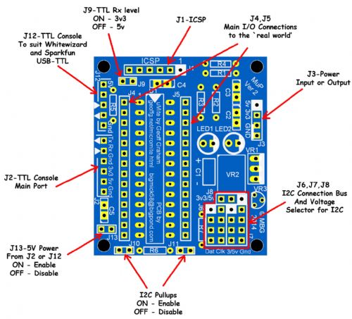 Changes from Ver 1 include: 1. Pullups for the I2C lines Dat & Clk with link options (J10,J11) to enable or disable them. 2. The addition of a 1k resistor to enable 5V TTL level Tx(in) to be used, this can be jumpered out (J9) if 3v3 TTL Tx(in) is to be used. 3. Fixed a silk screen overlay error that had the Clk and Dat labels for I2C reversed. 4. Added a new header location (J12) to support WhiteWizard’s USB module. 5. Added a Jumper (J13) to enable or disable 5V from the USB-TTL module inputs (J2 & J12). If MuP V2 is being supplied power through J3 AND a USB-TTL cable or adapter that has a 5V supply is connected, then J13 needs to be removed so that the two power sources will not `fight’ with each other. If 5V Power is required to be supplied via J2 or J12 then the jumper J13 will need to be installed. Jumper Layout can be seen here.