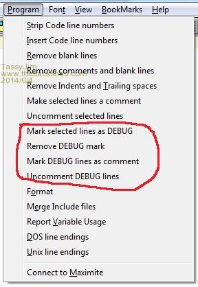Very close Peter. I spent a bit of time playing around with various options yesterday and there is a bit more playing to do. The first stage will not be a toggle. Highlight/Select a set of line(s) Click Mark Debug button MMEDIT appends 'Debug to the selected lines. or Click Remove Debug button remove 'Debug Lines which are already a comment for the full line are left alone. If there is a comment starting at the end of the line, the Debug options work as normal. You can then 'select all' and 'Mark DEBUG as comment' MMedit scans source and prepends ' to every line which ends with 'Debug