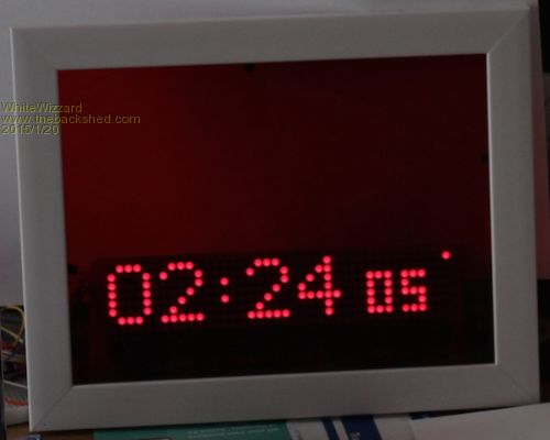 To give an idea of size, the frame is 24cm x 18cm. The electronics currently make it 5cm deep BUT I haven't made them SMD yet (a future intention). This unit currently only has one line of text but another is going to be added to show date and/or Temperature. The unit is controlled via an Apple Remote (to set alarm; and to set display options such as 12/24hr). I haven't produced a PCB for this yet but if there is interest here then I may get a batch designed and made with SMDs to minimise thickness (for wall hanging) . . . . WW |