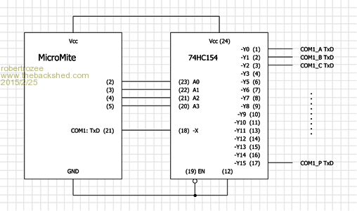 after recent discussions about additional serial TxD ports on the micromite i've put together an extremely simple design using a 74HC154 to switch a single TxD output between 16 different listening devices.