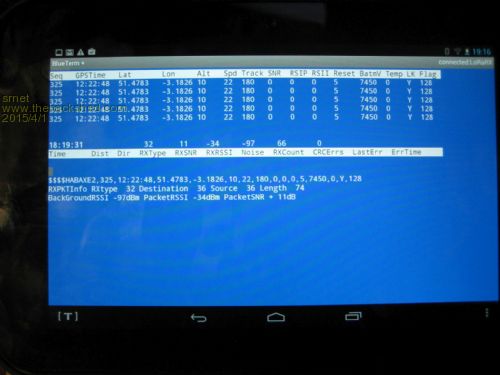 The receiver sends the data to COM2: via a HC-05 Bluetooth adapter to an Android tablet (Hudl) using VT100 terminal emulation control codes.