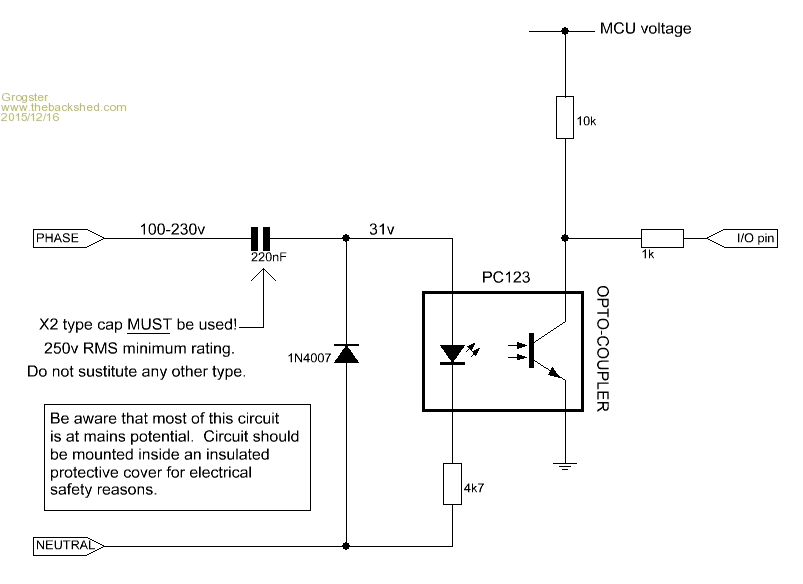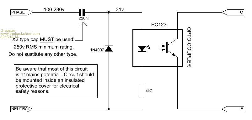 I often need to find out if a source of mains has failed. This is a copy of the circuit that can be found all over Google if you search for "LED on the mains", but with a couple of vital changes - X2 type mains cap and opto-coupled output for isolation. I guess I should mention at this point, that this circuit is only for those who are aware of the dangers of working with the mains, and who will take suitable safety precautions while working with this circuit. This thread is not intended for anyone not happy and competent working with the mains voltage. There may also be electrical compliance issues depending on where you are on the planet.