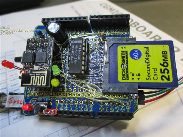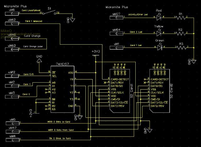 I am using a CG microboardII (Micromite Plus), MMbasic 5.1 , Esp8266 with ESPbasic ver 20, network data is via UDP network protocol. The top SDcard is removable and the 2nd one sits underneath. The SDcards are selected via the 74HC157 multiplexer.