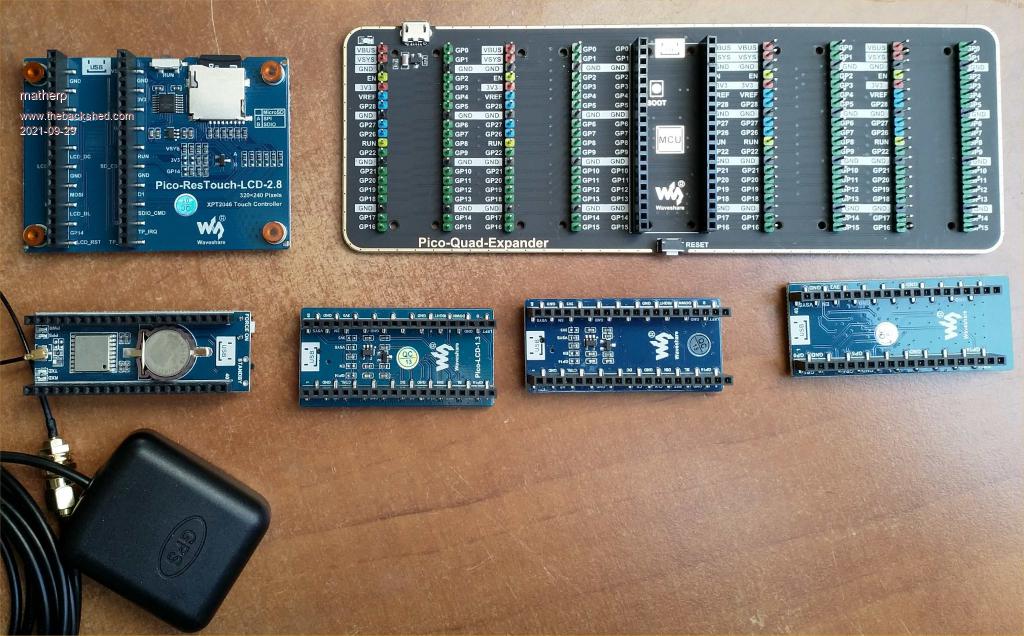 Also included are a Pico compatible mounted ESP8266, a Pico compatible mounted GPS, a 240x135 display with two buttons and a joystick, a 240x240 display with 4 buttons and a joystick and a 320x240 touch display with SDcard slot.