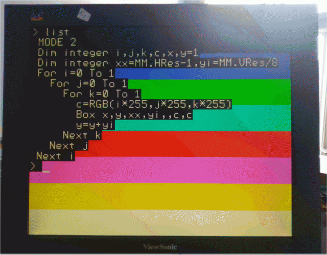 I put together this great little PicoStickVGA board: ![]() I used the resistors as specified, but got the same tan-ish white as with the PicoPear (posted recently), so maybe it's my monitor: ![]() The text on this image shows that I was able to fix the offsetting of the image to the left--there was a horizontal shift adjustment possible on my monitor. Same code as before: mode 2 dim integer i,j,k,c,x,y=1 dim integer xx=mm.hres-1,yi=mm.vres/8 for i=0 to 1 for j=0 to 1: for k=0 to 1 c=rgb(i*255,j*255,k*255) box x,y,xx,yi,,c,c y=y+yi next k next j next i I ran into two minor problems building the board: 1) I misunderstood where the right ends of R3 and R5 were, so soldered them into the holes for the external power (which I didn't intend to use); I noticed it and fixed it before powering it on; and 2) the holes for the pin header for the DS3231 module are smaller than the other holes--I had to file down the male header pins to make them fit. I haven't yet tried keyboard, RTC, or SD card. Will soon. PicoMite, Armmite F4, SensorKits, MMBasic Hardware, Games, etc. on FOTS |