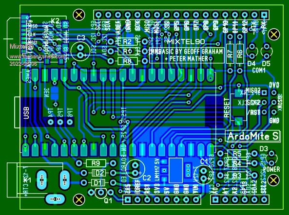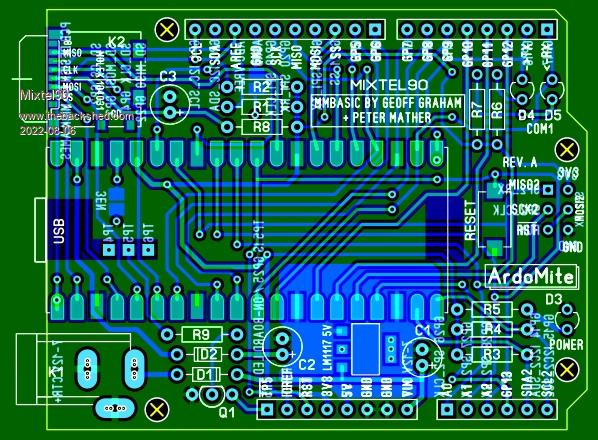I've changed it a bit: Changed the barrel jack to a 2.1mm pin type Added the 5V regulator Rearranged the power chain and so that it's like the Arduino now, accepting 7-12V input. Added the TX / RX LEDs. Added a solder blob link on the bottom for 3EN Re-wrote the Arduino IDE in MMBasic. (only joking) EDIT: Added a NPN transistor with base resistor from TP5 (the LED). Transistor is open collector, on spare pin 1 of POWER connector. And now there's a Reset button and AGND can be isolated from GND. . Edited 2022-07-29 08:17 by Mixtel90 Mick Zilog Inside! nascom.info for Nascom & Gemini Preliminary MMBasic docs & my PCB designs |