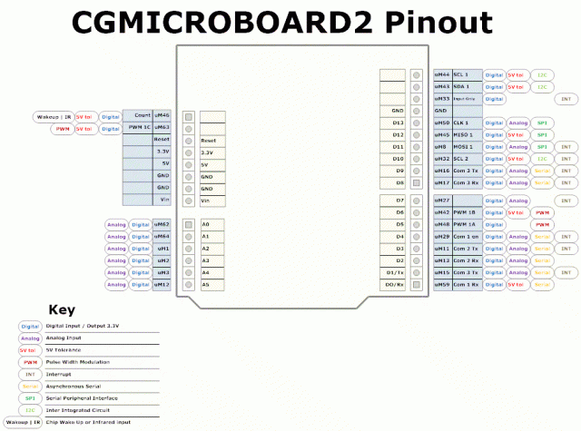 Pin correlation: (Tidied up a bit) Arduino ArdoMite UNO R3 1 Blank TP5 transistor collector 2 IOREF (3.3 or 5) 3V3 Input voltages shouldn't exceed this. 3 PC6 - Reset RUN 4 +3V3 3V3 5 +5V 5V 6 GND GND 7 GND GND 8 VIN VIN 9 PC0 - A0 GP26/ADC0 10 PC1 - A1 GP27/ADC1 11 PC2 - A2 GP28/ADC2 12 PC3 - A3 GP13 No A3 onPicoMite 13 PC4 - A4 GP14/I2C2_SDA No A4 on PicoMite 14 PC5 - A5 GP15/I2C2_SCL No A5 on PicoMite 15 PD0 - RX GP17/COM1_RX 16 PD1 - TX GP16/COM1_TX 17 PD2 - INT0 GP12 18 PD3 - INT1/PWM GP11/PWM5B 19 PD4 GP10 20 PD5 - PWM GP9/PWM4B 21 PD6 - PWM GP8/PWM4A 22 PD7 GP7 23 PB0 GP6 24 PB1 - PWM GP5/PWM3A 25 PB2 - SS/PWM GP21/PWM2B 26 PB3 - MOSI/PWM GP19/PWM1B/SPI_TX 27 PB4 - MISO GP20/SPI_RX 28 PB5 - SCK GP18/SPI_CLK 29 GND GND 30 AREF VREF Not identical in function. 31 PC4 - SDA GP0/I2C2_SDA 32 PC5 - SCL GP1/I2C2_SCL A3. A4 and A5 are not available. All I/O is at 3V3, not 5V. ----------------------- ICSP Connector 1 MISO2 GP28/SP2_RX Also ADC2 2 5V 3V3 Not the same as Arduino 3 SCK2 GP26/SP2_CLK Also ADC0 4 MOSI2 GP27/SP2_TX Also ADC1 5 RESET2 RUN 6 GND GND Edited 2022-08-02 07:09 by Mixtel90 Mick Zilog Inside! nascom.info for Nascom & Gemini Preliminary MMBasic docs & my PCB designs |