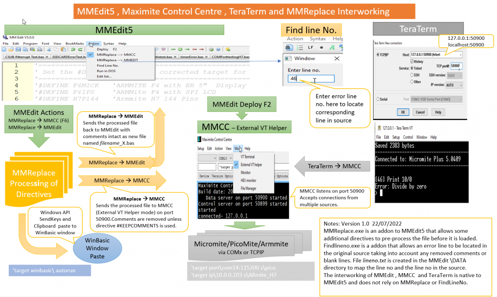 MMReplace version 5 MMReplace.exe is a utility written in PureBasic which supports the addition of several new Directives which can be used while developing code in MMEdit Version 5. It is integrated into MMEdit by calling it from within the MMEdit Action menu.The history and original MMReplace that supports MMEdit3 and MMEdit4 is found here.. MMEdit Version 5 is detailed in this TBS thread. Integration into MMEdit5 Three items are added to the Actions menu. ![]() MMReplace --> MMCC F6 This calls MMREPLACE.EXE which processes any DIRECTIVES, deletes comments, blank lines and loads the program via MMCC (Maximite Control Centre) MMReplace --> MMEdit This calls MMREPLACE.EXE which processes any DIRECTIVES and sends the code and comments back to MMEdit as a new file. Find Line No. This calls FINDLINENO.EXE which prompts for an error line no to be input, and this line is then located in the original source file, taking into account comments and directives which were not sent as part of the loaded code. (This is done via sending keystrokes an does not expect SUBs/Functions to be folded) The key DIRECTIVES See the attached PDF for full details and other directives, but here are the key directives. #REPLACE longname shortname At load time all occurrences of longname are replaced with shortname. This can save program memory when the program is loaded/stored and can give small increase in execution speed when variables are resolved, but still allow the use of descriptive variable names in the code.e.g Another use is to decrease the number of discrete variables required by using an array to store similar variables, while still allowing your code to have meaningful names. e.g. Another use is to reduce the memory taken by discrete short strings by placing them in an array which can have the string length set to < 255, while also keeping you code meaningful. e.g. #DEFINE #IFDEF #IFNDEF #ELSE #ENDIF These directives allow conditional loading of sections of the code,by branching on the #DEFINE variables set. This allows one source to be maintained and the respective #DEFINE directives uncommented to load the desired code. This can include including the appropriate 'target port\com7:115200 setting for MMCC to send to the appropriate connected device. Multiple nested #DEFINE statements can give good control over what is loaded. The one source can hold multiple test cases and these can be enabled as required. Alternate commands required by different devices can be conditionally selected e.g. #LIBRARYSTART #LIBRARYEND #LIBRARYLOAD Allows management of Library code where it is supported. #ENDCODE This directive also helps support a single source file for the project. This directive is placed at the end of the valid MMBasic code and marks the end of code to be loaded. This allows other relevant code/notes to be stored after the directive but in the same source file. e.g. associated Annex code, Arduino libraries to reference during development, other notes etc. these do not affect the load time. 'target winbasic\ autorun is a special case The winbasic\ option for the MMCC ‘target directive is a special case handled by MMReplace and is not part of MMCC. It will only work with windows. It will find an open MMBasic for Windows window and paste the code into.It will give an error message if the window cannot be found. Once the MMBasic for Windows window is found: • The code to be loaded is placed in windows clipboard • A CNTRL C is sent to stop any running program • CLS is sent via keystrokes to clear the screen • AUTOSAVE filename is sent via keystrokes to the window • CNTRL V is sent to paste the contents of the clipboard • F1 (or F2 if autorun is part of the ‘target) is sent to save and optionally run the program This should be considered experimental. Works well on my machine, but there are some timings between the keystroke up/down events which may not suit all situations. The default is 50 microseconds. The directive below will allow some tuning if keystrokes are missed. delay is the new value to be used. #WINDELAY delay The filename used to save the code is the same as the filename in MMEdit DOCUMENTATION and INSTALLATION The attached pdf explains in more detail and the zip file contains the files required and installation instructions. The PureBasic source is included, but will require a licensed copy as it uses calls to the WIN32 API and this is not availalble in the free version. MMReplace5.pdf MMReplace5Distribution.zip MMEdit5, MMCC, TeraTerm and MMReplace Interworking This diagram shows the relationship of the various components. ![]() F4 H7FotSF4xGT |