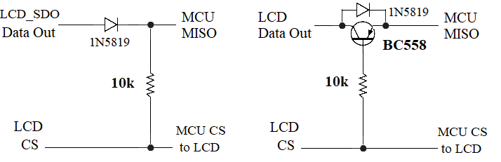 Here it is. https://www.thebackshed.com/forum/ViewTopic.php?TID=11419&P=3#191429 The transistor only connects LCD_SDO to MISO when LCD_CS is pulled low. Most people find just the resistor is enough but I found SD card access unreliable. |