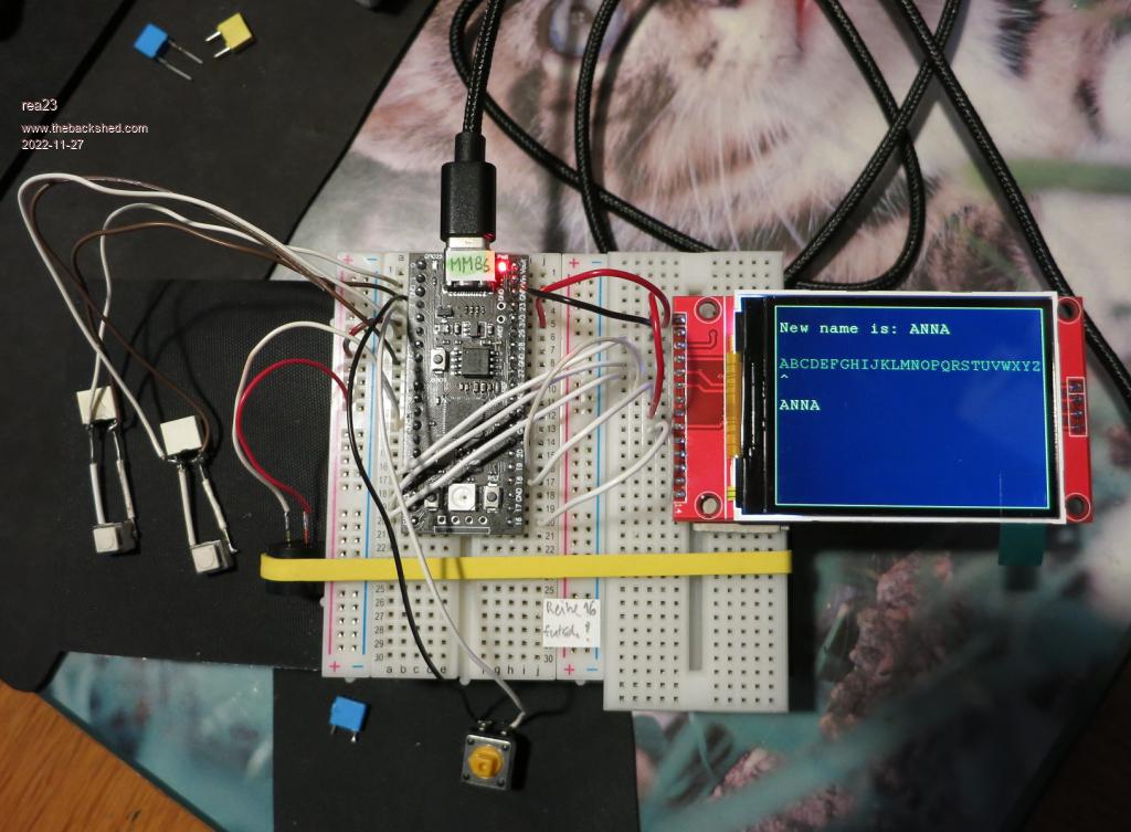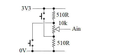 A button can be added to the pot. input without using an extra pin. Add resistors (about 1/10th of pot. value) between the top and bottom ends of the pot. to the rails and put the button from wiper to ground. The bottom resistor ensures voltage can only reach zero when the button is pressed. The top resistor prevents a short if the button is pressed while the wiper is at the top. A short press enters the letter and a long one enters the name, as in the above program. Edit Forget that. Two buttons can be added to the pot. input without using any extra pins. Use the second to delete the last letter. ![]() The top button inputs 3V3 and the lower 0V while the pot goes from 0.16V to 3.14V. Edited 2022-11-29 17:23 by phil99 |