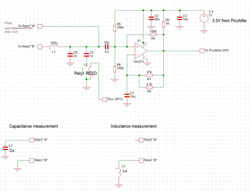 Hi Pluto, Nice, you are building an oscillator (LC) around an opamp (LMV331) and and parallel/serial place inductors and capacitors under test. Very basic, smart. You can of coarse extend the range by having an additional relay replace the 100uH with 10mH. Maybe have to adapt C1 and C4. Thanks for sharing.... Volhout PicomiteVGA PETSCII ROBOTS |