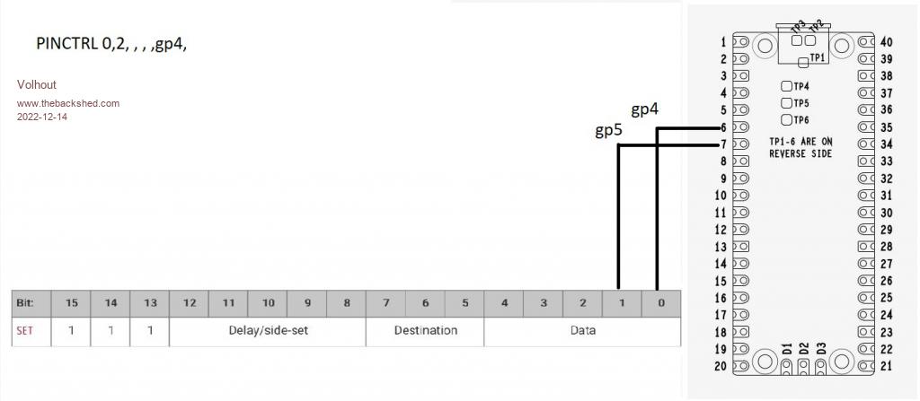 For #2 this is all I can manage. It works after a fashion but the phase shift is a little over 180 deg. SetPin gp0,pio1 SetPin gp1,pio1 p0=Pio(pinctrl 0,1,,,,gp0,) p1=Pio(pinctrl 0,1,,,,gp1,) f=2000 * 5.4 'Hz for 2700Hz out. 'pio program 'line code comment ' 0 E081 GP0 output ' 1 E101 pin high, dly=1 ' 2 E000 pin low ' 3 0001 jmp 1 'program pio1 PIO program line 1,0,&he081 PIO program line 1,1,&he100 PIO program line 1,2,&he001 PIO program line 1,3,&h0001 'write the configuration PIO init machine 1,0,f,p0,,,0 PIO init machine 1,1,f,p1,,,0 'start the pio1 code PIO start 1,0 Do While Pin(gp0) : Loop PIO start 1,1 'Check the frequency in MMBasic SetPin GP6,FIN Do Pause 1000 Print Pin(gp6);" Hz at GP6" Loop End All attempts to invert the output within the PIO program failed. . |