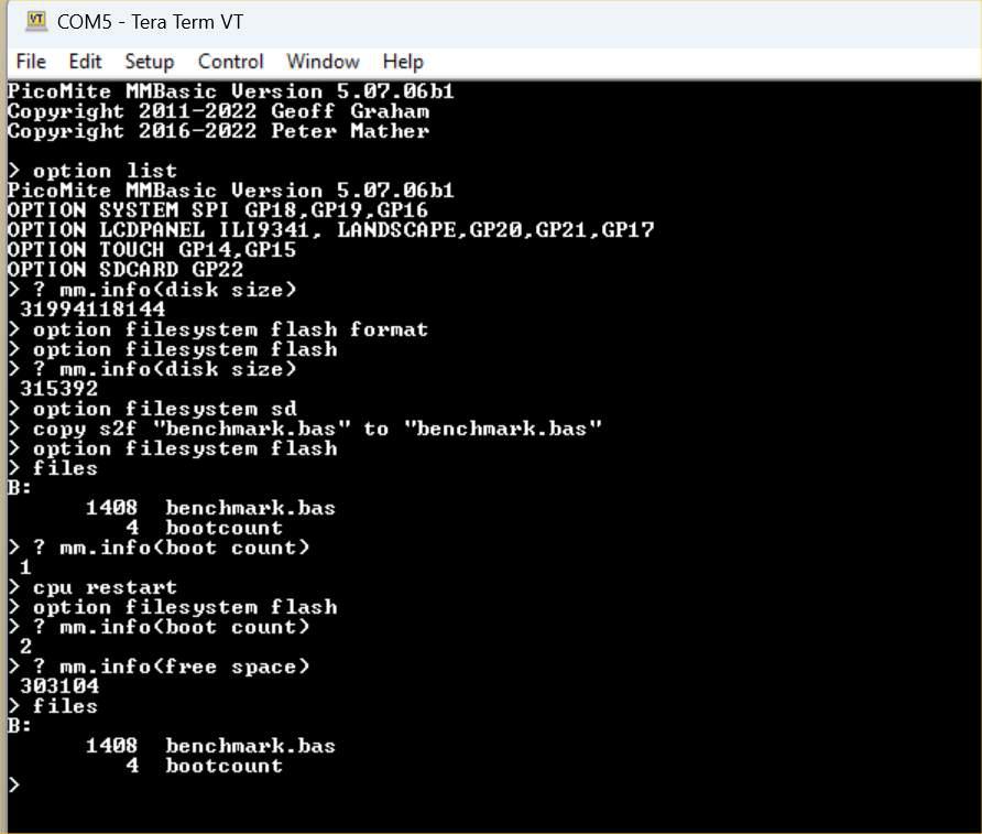 Forum Index : Microcontroller and PC projects : PicoMite V5.07.06 preview - flash file system