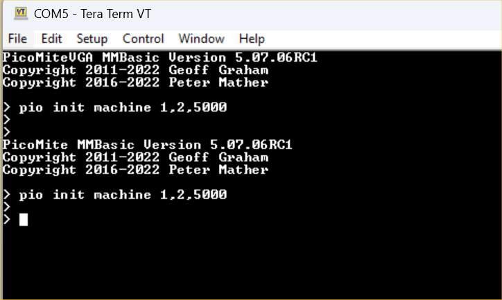 Hi Pter, pio init machine 0,0,f PIO init machine 0,0,f,,e,,0 PIO init machine 0,0,f,p,e,,0 PIO init machine 0,0,f,,e,s,0 PIO init machine 0,0,f,p,,,0 not Only the last one does not work, all other combinations work. You need "e" (execctrl) when you add anything after the frequency. Maybe an obscure reason. We can work around it. It was just awkward.. PicomiteVGA PETSCII ROBOTS |
