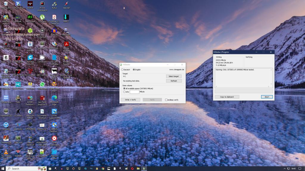 Warning: Only 33772 of 1999983 MByte tested. The media is likely to be defective. 20.2 GByte OK (42493056 sectors) 12.7 GByte DATA LOST (26672000 sectors) Details:2.3 MByte overwritten (4866 sectors) 0 KByte slightly changed (< 8 bit/sector, 0 sectors) 12.7 GByte corrupted (26667134 sectors) 65 KByte aliased memory (130 sectors) First error at offset: 0x0000000510b90000 Expected: 0x0000000510b90000 Found: 0xffffffffffffffff H2testw version 1.3 Reading speed: 17.7 MByte/s H2testw v1.4 If it's too good to be true.... etc. :) |
