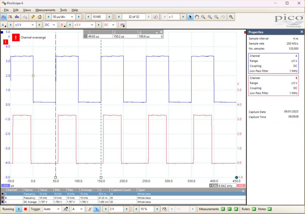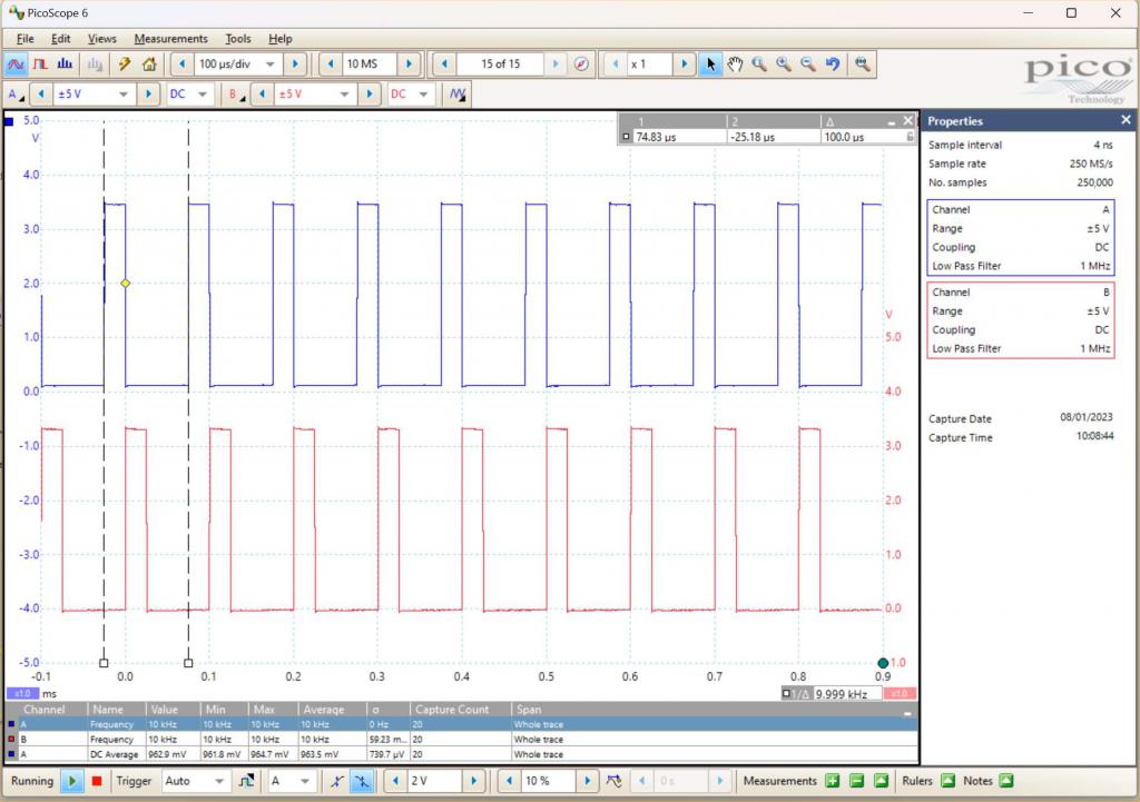 In the margin you are limited by the number of clock pulses in the time period @400KHz with 1CPU @ 378MHz you have 945 clock periods per cycle so half of that is 472 and therefore a "shorter" pulse must be 470. Either method hits exactly the same limitation. setpin gp0,pwm setpin gp2,pwm pwm 0,400000,50,,1 pwm 1,400000,49.8,,1 pwm sync 0,0.1 pw gives you a symmetrical pair of pulses with exactly 1 count offset (2.6ns) at each end when the CPU clock is 378MHz. |