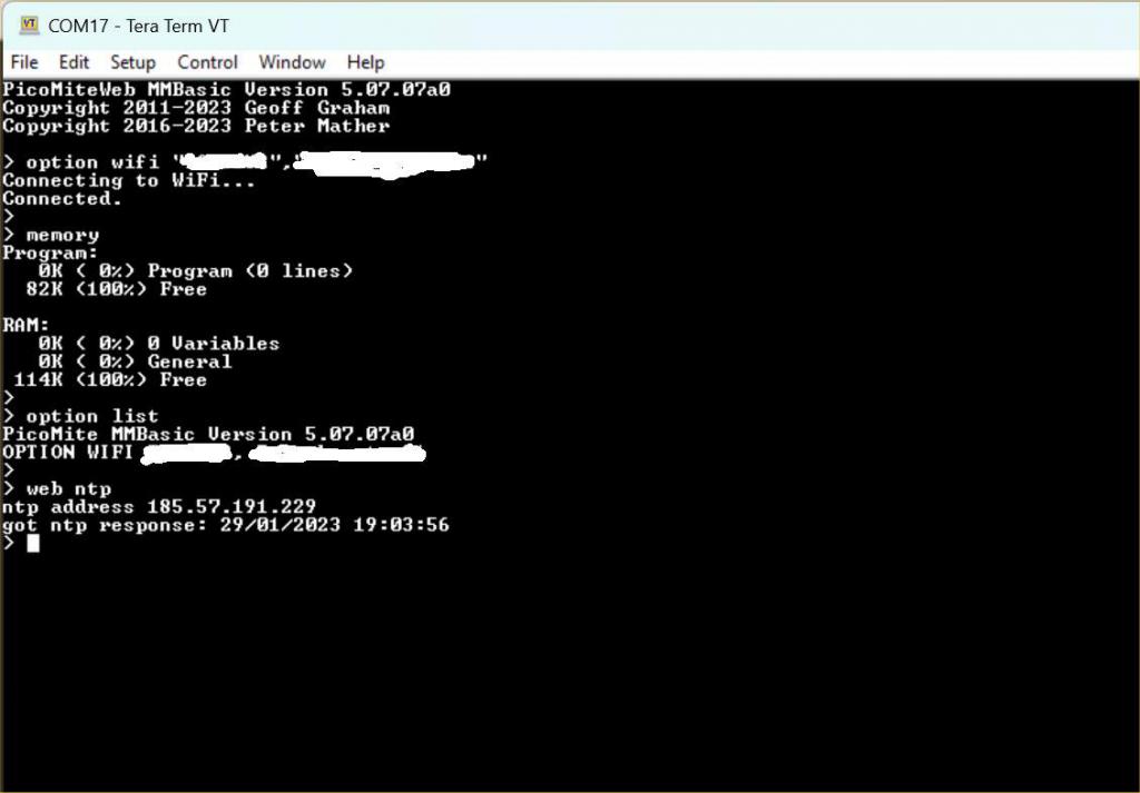 It's cold and dull in the UK and I was bored.... If you have a pico_w try the attached PicoMiteWeb.zip The firmware is identical to the PicoMite except for the following: Removed GUI command, CTRLVAL command and CTRLVAL function Changes Available memory - still to be tuned - may increase or decrease Added OPTION WIFI SSID,PASSWORD To disable wifi use: OPTION WIFI "","" WEB command with currently one sub-command WEB NTP 'connects to an NTP server ("pool.ntp.org") and updates the system time and date TBD All the other WEB subcommands ![]() Edited 2023-01-30 05:10 by matherp |